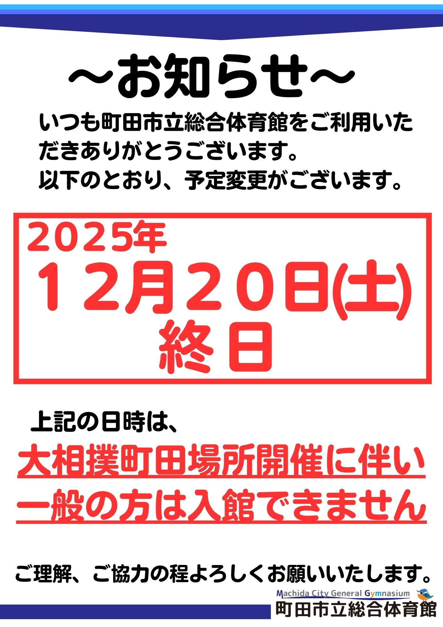 大相撲町田場所開催に伴う予定変更のお知らせ 【12/20(土)終日入館不可】