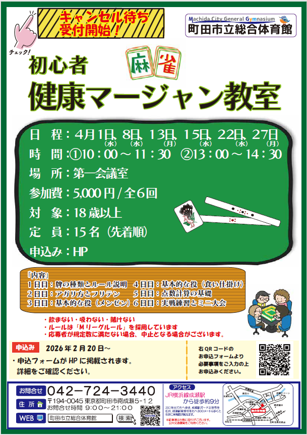 4月1日より開始する初心者健康マージャン教室のキャンセル待ち応募ができるようになりました!