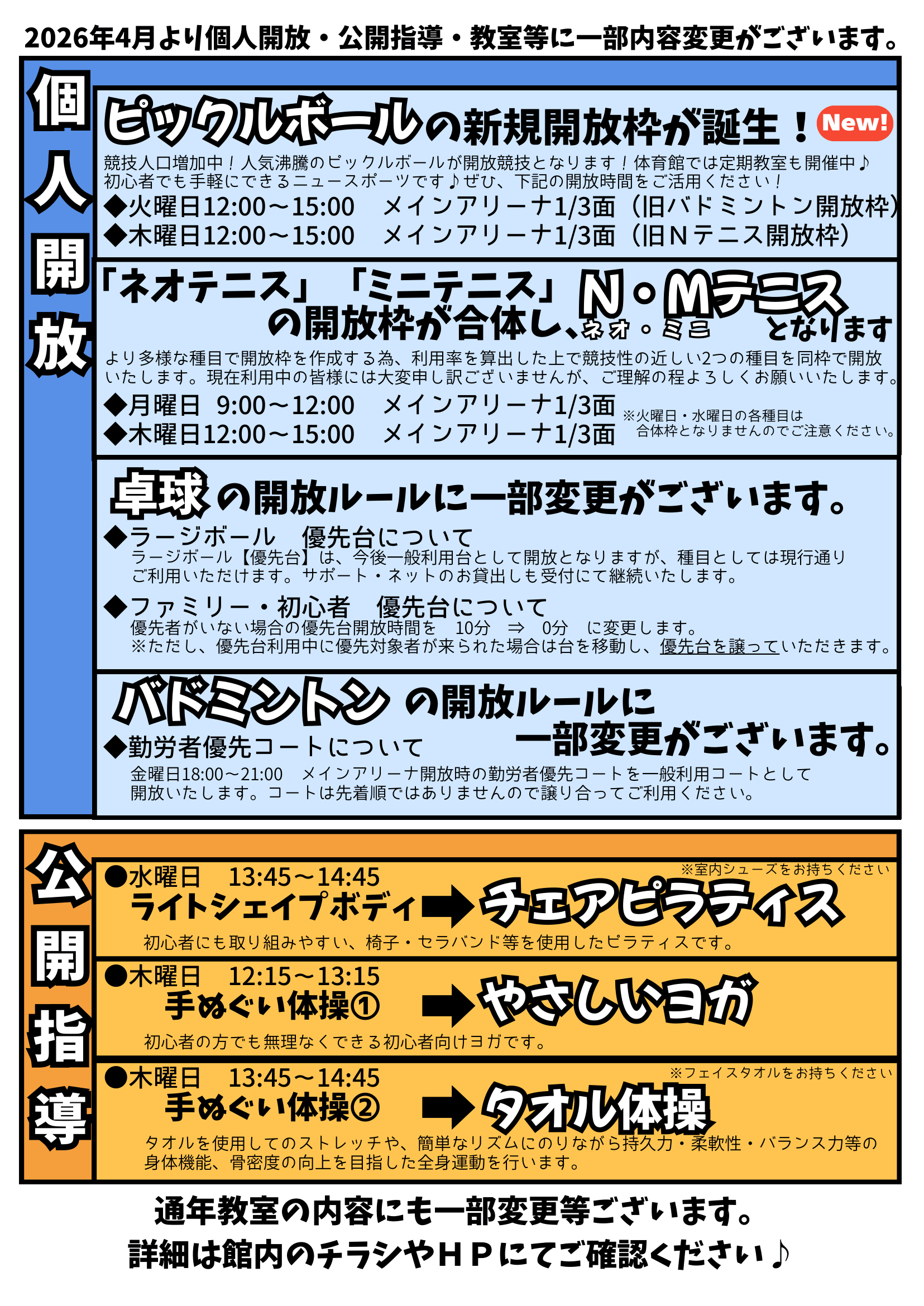 2026年4月より下記のとおり開放等の種目やルールなどを一部変更いたします。