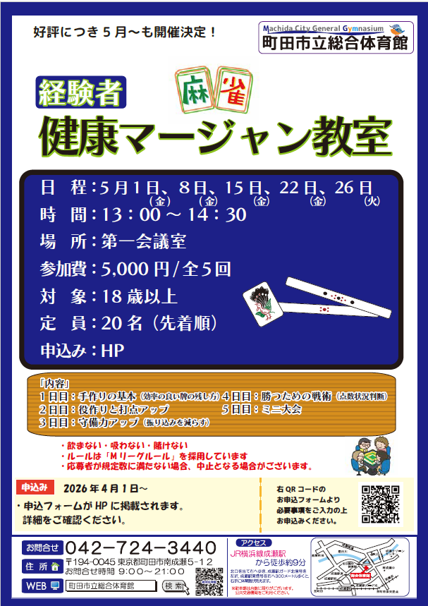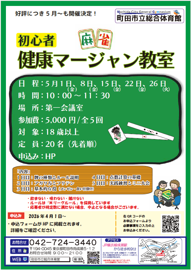 キャンセル待ち受付開始!健康マージャン教室_5月