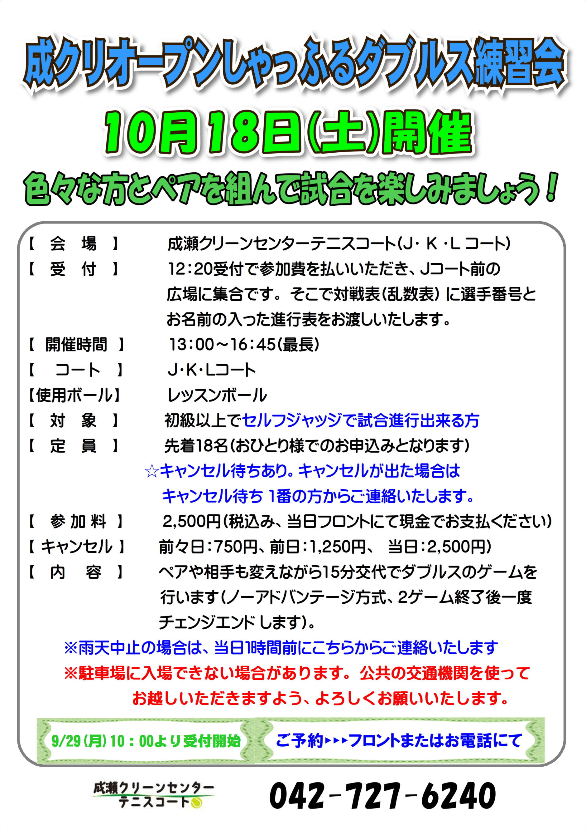 【申込み】9月29日(月)10:00~フロントまたは電話受付(042ー727ー6240)