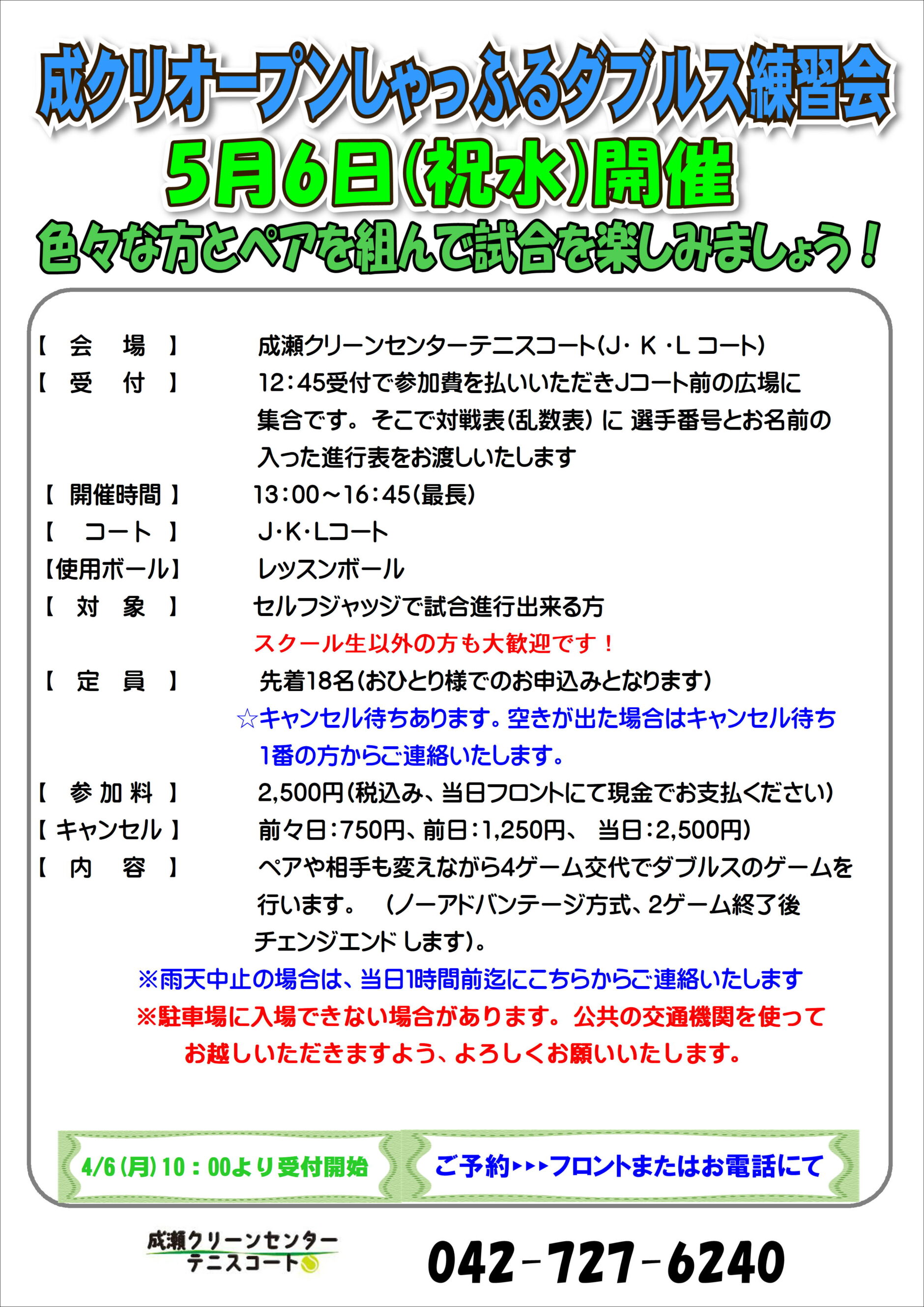 【申込み】フロントまたは電話受付(042ー727ー6240)